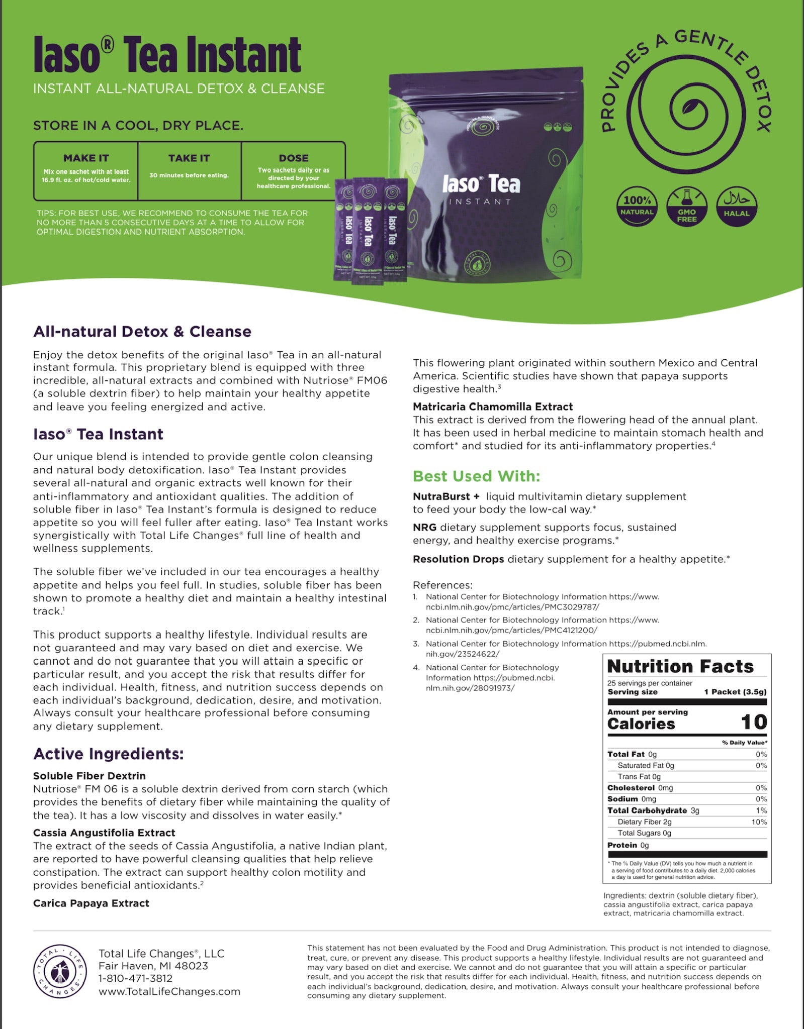 Experience the cleansing benefits of our original Iaso® Tea in an instant blend that is easy to make and easy to take. Our unique proprietary blend is formulated to remove harmful waste from your body and make your trips to the restroom more productive. Iaso® Instant Tea is equipped with three powerful extracts combined with Nutriose® FM 06, a soluble dextrin corn fiber, to help support digestion and a healthy appetite. This instant formula is the perfect complement to your diet and weight-loss program!*